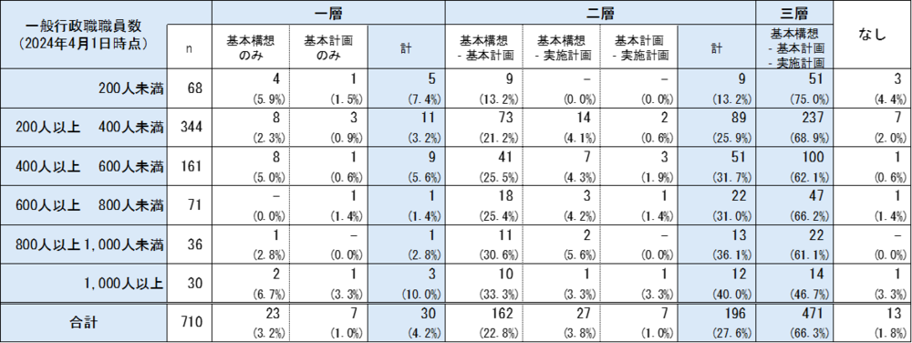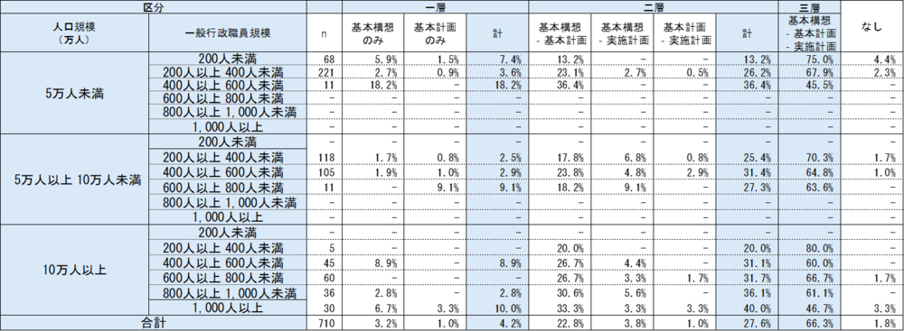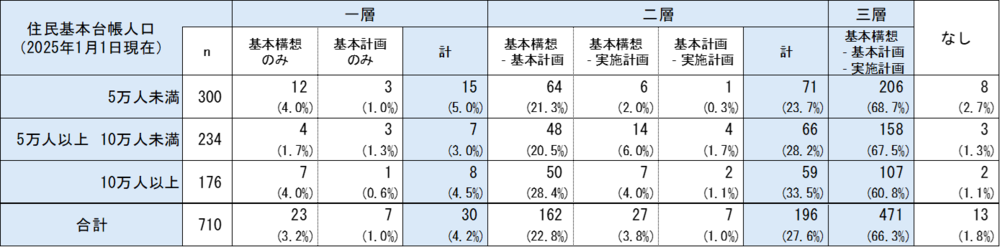 1995年の自治省による市町村の総合計画に関する調査では、市レベルにおいて85.5%が三層構造を採用しているという調査結果があるが、この30年間で三層構造から二層構造や一層構造へ見直した団体が多数あると推察される。
