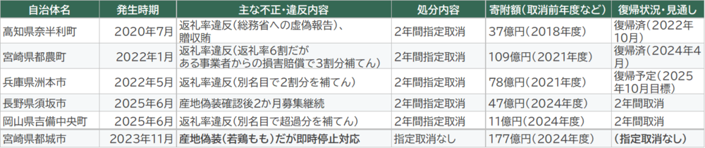 今回の須坂市・吉備中央町の事例以前にもふるさと納税の指定取消事例が3件ある。この構造を理解することは、今後の教訓として極めて重要である。
