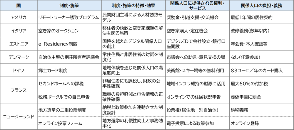 ふるさと住民登録制度の制度設計にあたっては、諸外国の先行事例から多くの示唆を得ることができる。以下の表は、非居住者との関係構築、政策参加、体験型インセンティブ、民間連携、デジタル活用といった観点から、諸外国の制度を比較したものである。制度の目的や対象者、提供されるサービス、負担のあり方を整理することで、日本における制度設計の方向性を具体化する手がかりとなる。特に、関係人口を一時的な支援者にとどめず、地域の担い手として位置付けるための制度的工夫が各国に共通して見られる点は注目に値する。