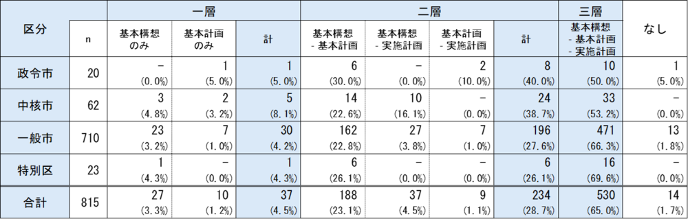 1995年の自治省による市町村の総合計画に関する調査では、市レベルにおいて85.5%が三層構造を採用しているという調査結果があるが、この30年間で三層構造から二層構造や一層構造へ見直した団体が多数あると推察される。